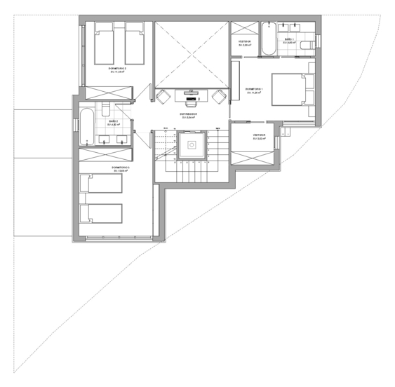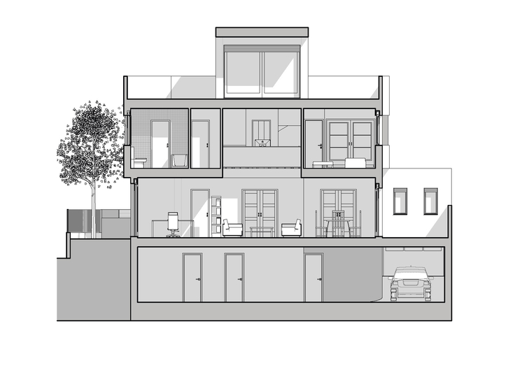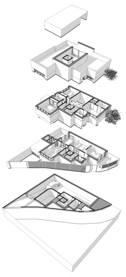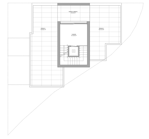 El programa funcional dispone en planta baja salón, comedor, cocina, aseo y distribuidor; en planta primera tres dormitorios, el principal con vestidor, y dos cuartos de baños; y en planta de cubiertas una gran terraza con una pequeña habitación. La planta semisótano se destina aparcamiento, trasteros e instalaciones.