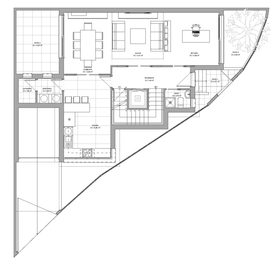 En planta baja, la disposición de las piezas salón - comedor - cocina, proporciona una sucesión de espacios corridos que conectan con los patios exteriores, dando como resultado un gran espacio unitario. La doble altura que conecta la planta baja, el salón, con el distribuidor de la planta primera, proporciona una gran sensación de amplitud, dotando de iluminación natural todas las estancias interiores.