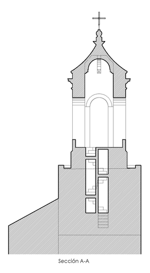 Sobre un antiguo torreón medieval de mampostería enripiada con refuerzo de sillares regulares en las esquinas y de planta cuadrada, se coloca una torre más pequeña del siglo XVI, también cuadrada pero de aparejo isódomo y con vanos de medio punto en cada una de sus caras. Se remata con una cornisa sobre la que arranca un chapitel de piedra. Se trata de el último cuerpo del antiguo campanario de la iglesia.