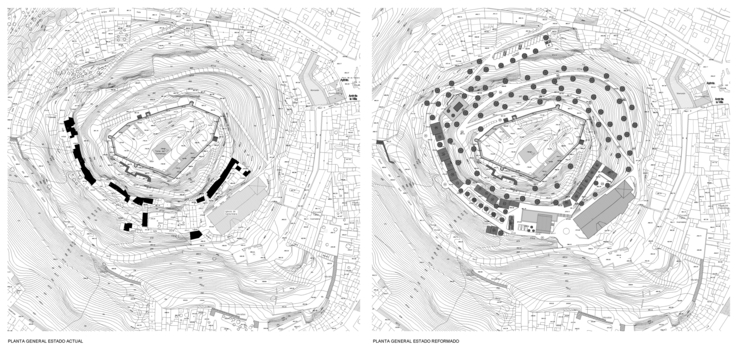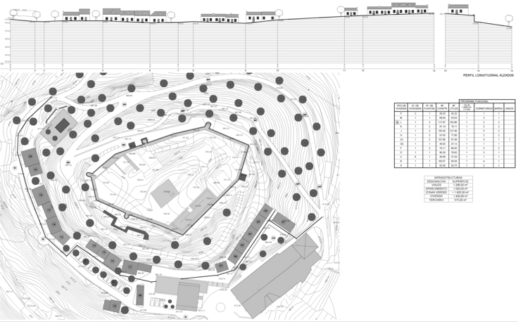 La intervención propuesta se centra en el paseo de ronda que circunda al castillo bajo la muralla. Se recupera el parcelario, levantando viviendas tradicionales que repiten las alturas, tipología e imagen originarias, adecuando el conjunto a una villa, con un uso turístico.