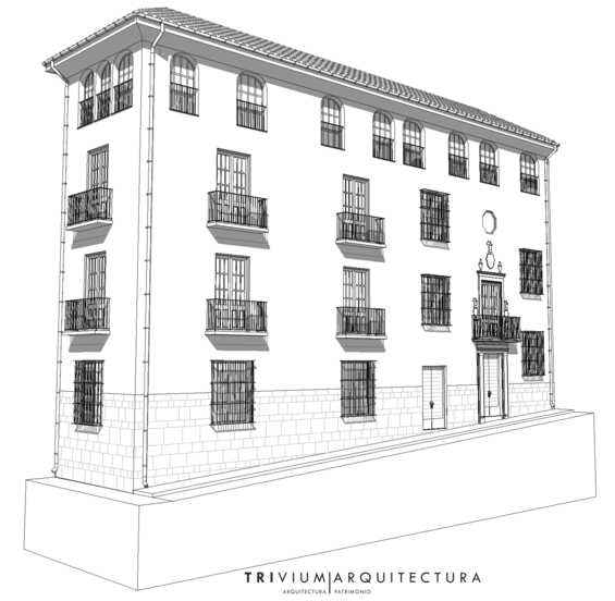 Rehabilitación de edificio existente, de tres plantas de altura, elegante y proporcinada fachada y cubierta inclinada de teja árabe. La entrada principal se encuentra encuadrada por una bella portada de piedra, que alcanza a la planta primera, flanqueada por escudos heráldicos.